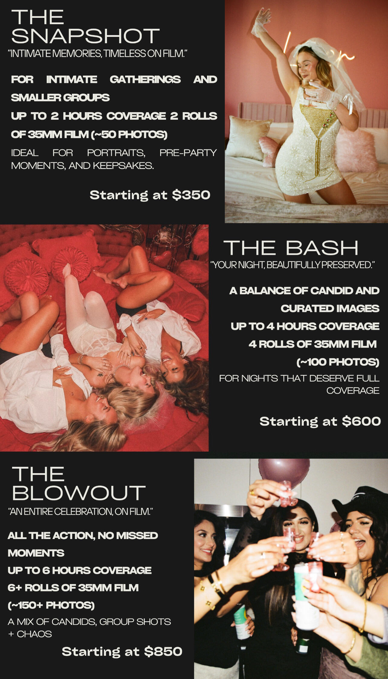 We are a photography company focused on capturing real, candid moments on 35mm film and digital for wedding parties. After moving to Nashville and what started as a general passion for photography naturally led me to the bachelorette world - where the energy is high, the laughs are constant, and every moment feels worth remembering. I focus on documenting the in-between - the genuine connections, the inside jokes, and the fun that unfolds when friends come together to celebrate. My goal is to give you photos that feel like you, just having the best time with your people.