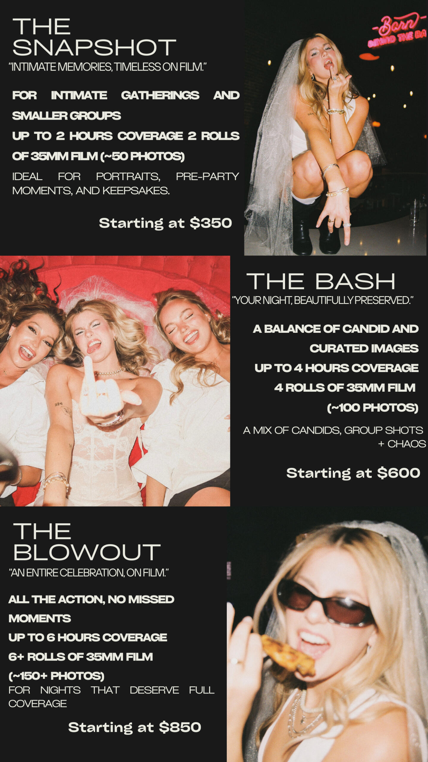 We are a photography company focused on capturing real, candid moments on 35mm film and digital for wedding parties. After moving to Nashville and what started as a general passion for photography naturally led me to the bachelorette world - where the energy is high, the laughs are constant, and every moment feels worth remembering. I focus on documenting the in-between - the genuine connections, the inside jokes, and the fun that unfolds when friends come together to celebrate. My goal is to give you photos that feel like you, just having the best time with your people.